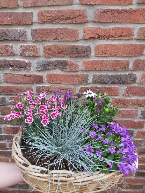 Mooie mand opgevuld met buitenplanten welke de hele zomer bloeien.